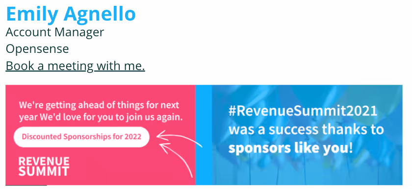 Leveraging employee email signatures and email ad campaigns allows you to change out your banner creative as your event coasts through its lifecycle. This means that from teaser content, to launch, to early bird registration, to location announcement, to keynote speaker highlights, to last chance, to event occurrence, you can swap out graphics as needed to keep it fresh and timely.