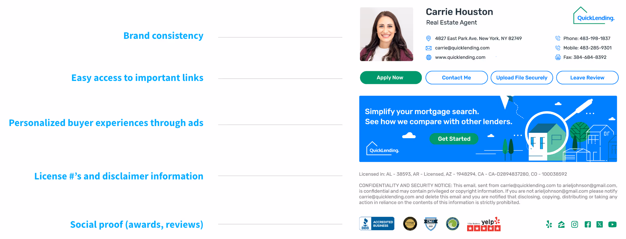 Email signatures can also potentially present regulatory and compliance issues (and a risk to your brand) if a sender’s NMLS is incorrect or not up-to-date. Outdated certifications could also lead to missed opportunities to establish trust and credibility.